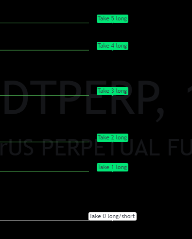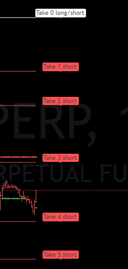 Желтая - нулевой тейк, если цена долгое время ходит вдоль данной линии, можно /стоит сократить позицию/выйти и дождаться более менее уверенного движения на другой торговой парой или на этой спустя несколько сделок. Также можно использовать как первый тейк, если точка входа находится в достаточном расстоянии о нее.