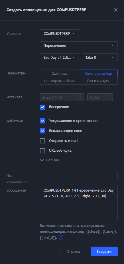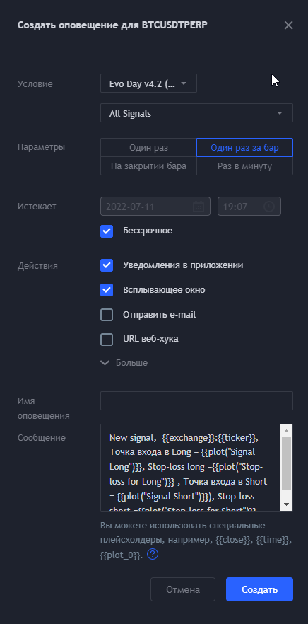 Если Вы настраиваете оповещения на 5 мин ТФ на паре BTC / USD, то уведомления будут приходить только на данной торговой паре и ТФ.
