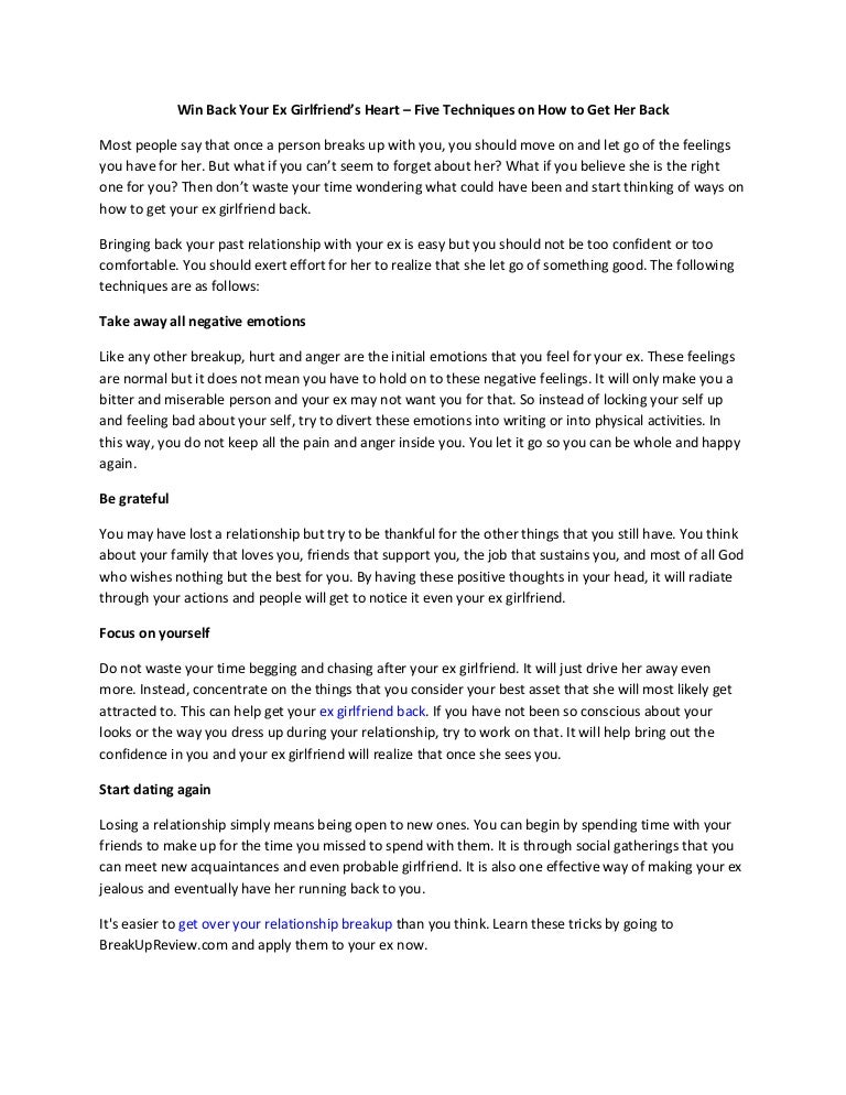Another tip to help you get your ex girlfriend in a relationship again is⦠. 2 . Don't shy away from starting the ex back process . Sometimes a guy worries that if he approaches his ex too soon after the break up, she will almost certainly reject him .