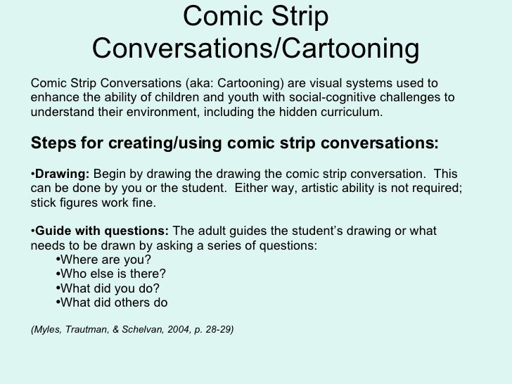 A comic strip conversation uses simple drawings to visually outline a conversation between two or more . . . example, the first time you introduce comic strip conversations have your child describe an activity that he/she enjoys (such as going to McDonalds, visiting the zoo etc .) and introduce a few symbols . . .