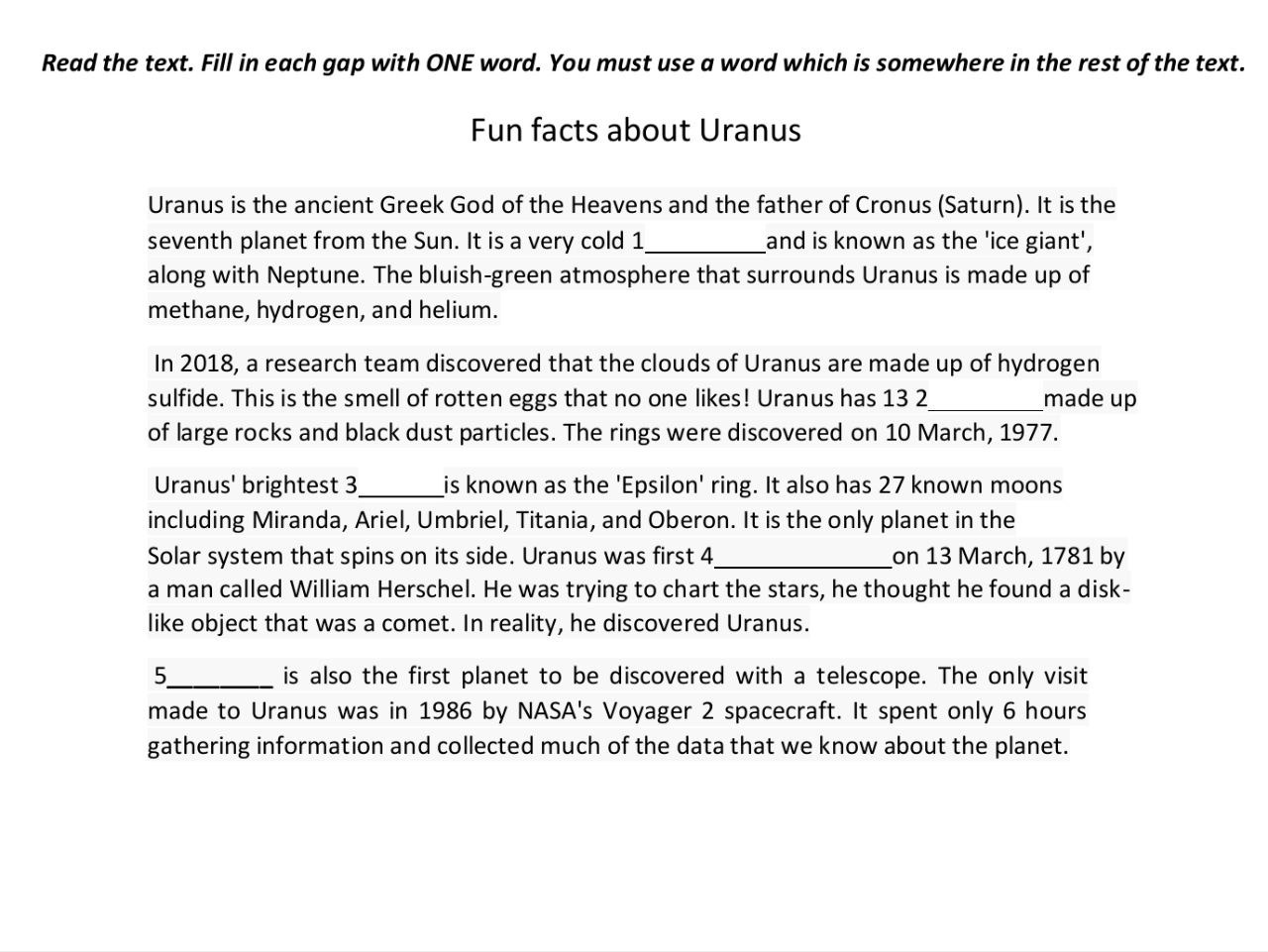 Exercise 4Answers1 - PLANET 2 - RINGS3 - RING4 - DISCOVERED5 - URANUSMR. ENGLISH ACADEMY+998 33 062 2211t.me/murphymrenglishinstagram.com/mr.english.uzyoutube.com/mrenglishacademyuz