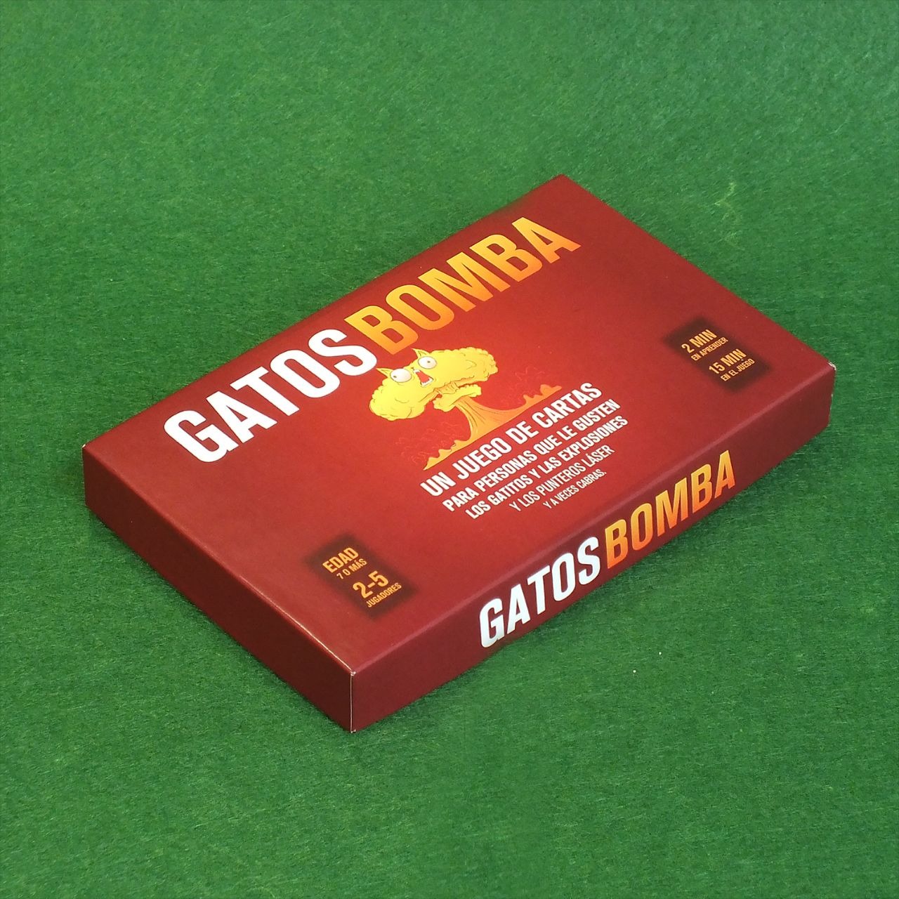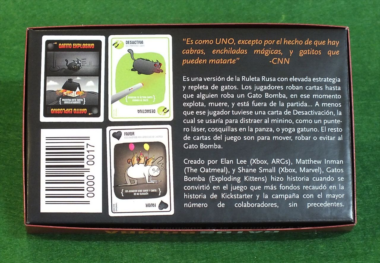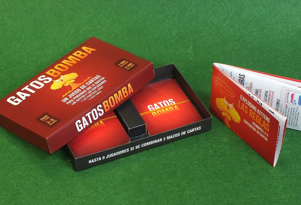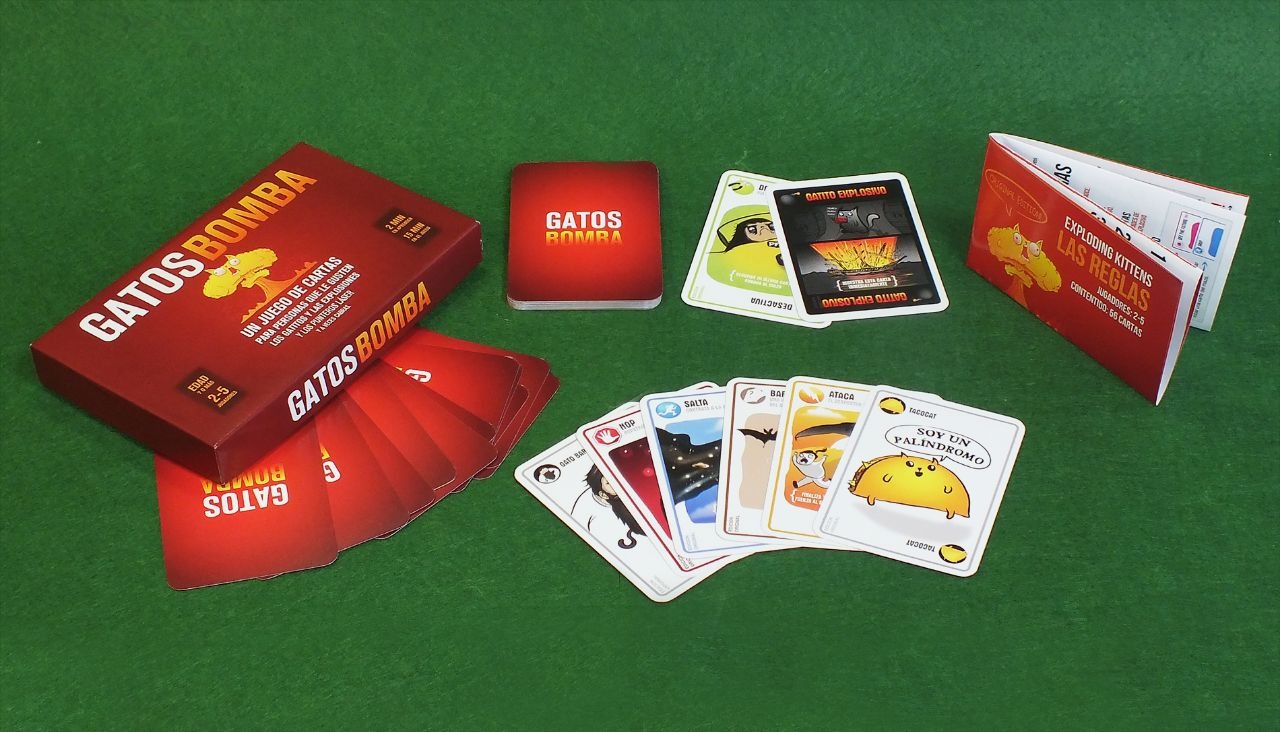 Juego de cartas de la categoría Filler. Las reglas son muy sencillas, ideal para jugar con amigos que deseen adentrarse en el mundo de los juegos de mesa. El juego consiste en evitar el "Gato explosivo" pasándoselo a otros jugadores (como si de una Ruleta Rusa se tratara). El ganador será el último jugador que quede en la mesa sin explotar. Para ello, los jugadores utilizarán la estrategia y la malicia. El juego cuenta con dos expansiones IMPLODING KITTEN y STREAKING KITTEN.