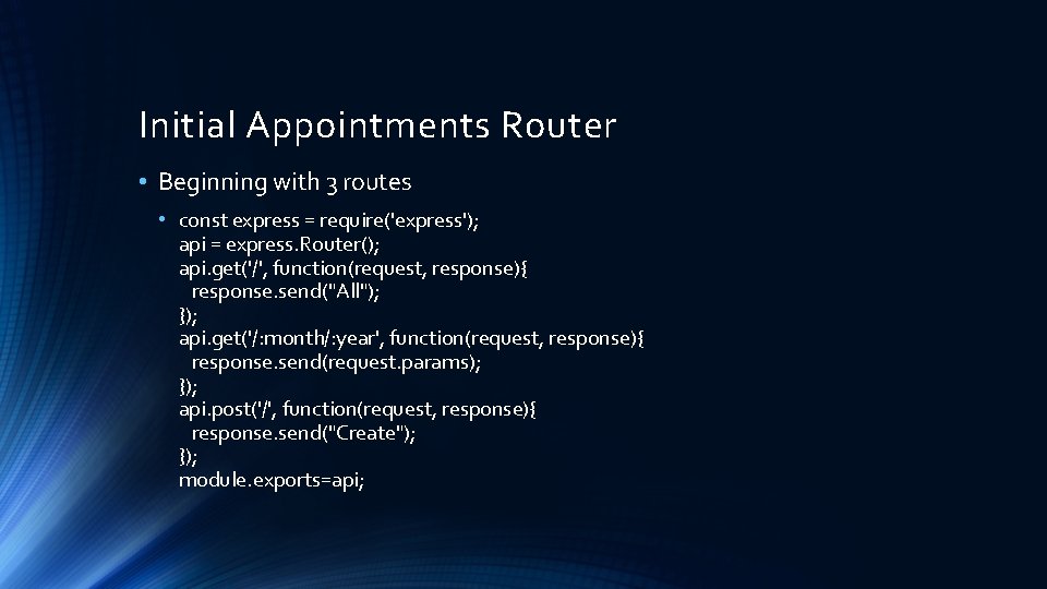 Route Parameters in Express . Oct 23, 2019 . In Express , route parameters are essentially variables derived from named sections of the URL . Express captures the value in the named section and stores it in the req . params property . const app = require('express') (); // `:userId` is a route parameter .