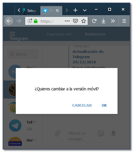 10. De forma predeterminada Telegram se presenta con la opcion de Escritorio. Si redimensiona el ancho de la ventana, Telegram mostrara la opcion de utilizar la versión de Telefono o Movil.