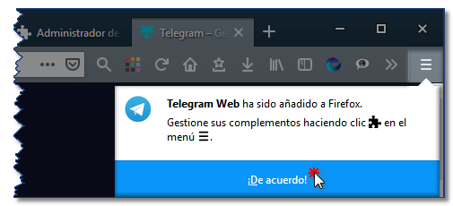 7. Una vez le da a la opción Añadir, Firefox le notifica que Telegram web se añadió a Firefox y le pide confirmar si está de acuerdo.