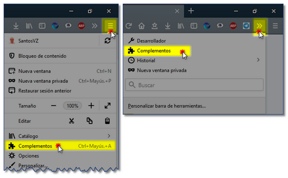 3. En Complementos se abrirá la ventana de about:addons de Firefox, donde colocar la extensión a localizar.