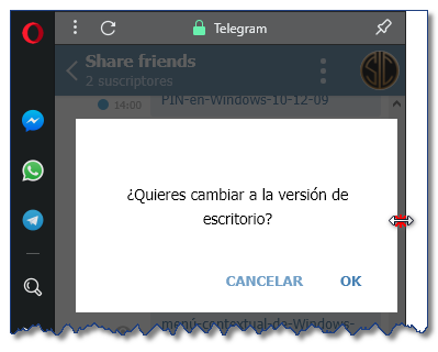 1. De forma predeterminada Telegram se muestra en la versión de Móvil (teléfono), pudiéndose cambiar a la versión de Escritorio redimensionando el ancho de la ventana de Telegram.