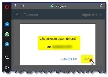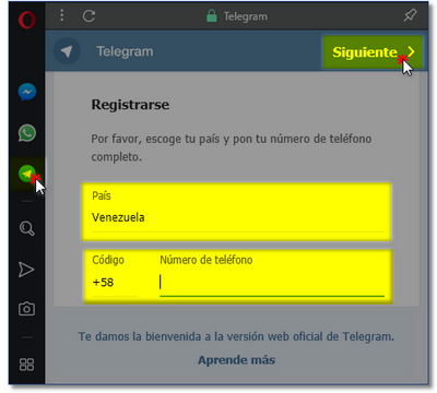 2. Hacer clic en el icono de Telegram situado en la Barra de marcadores, apareciendo la opción de colocar los datos (país y teléfono) del usuario. Una vez colocados presionar al botón Siguiente.