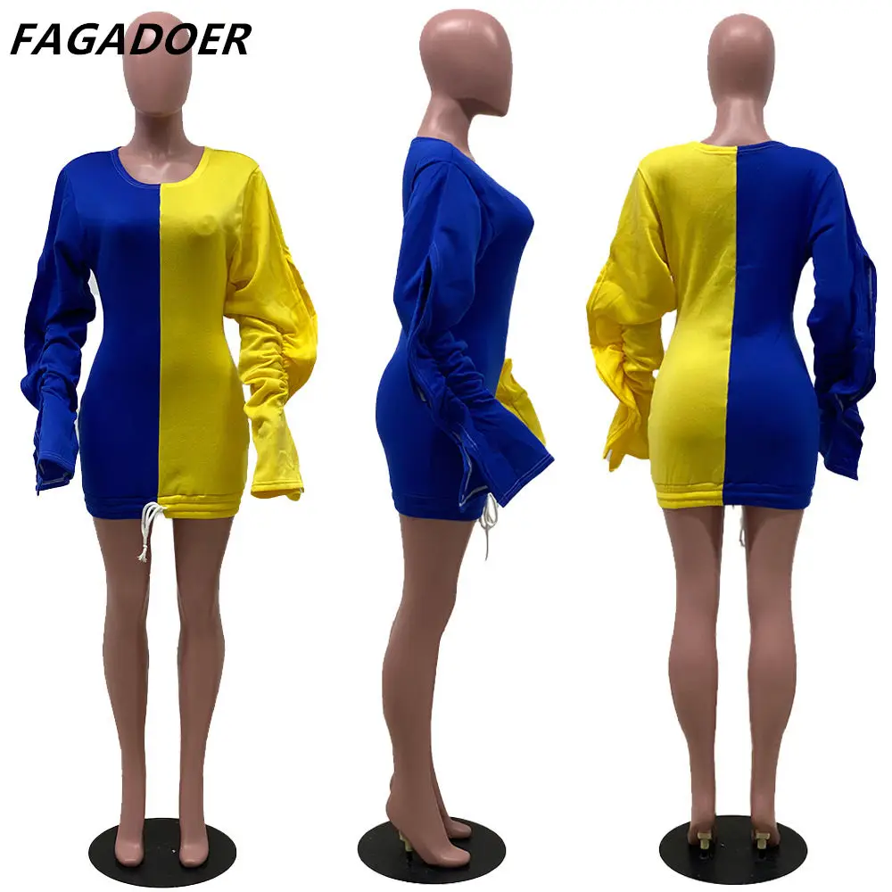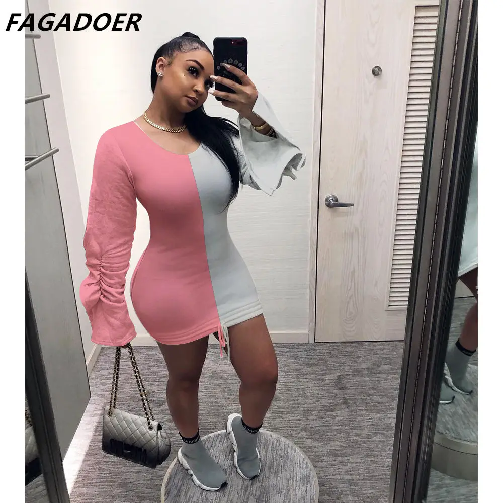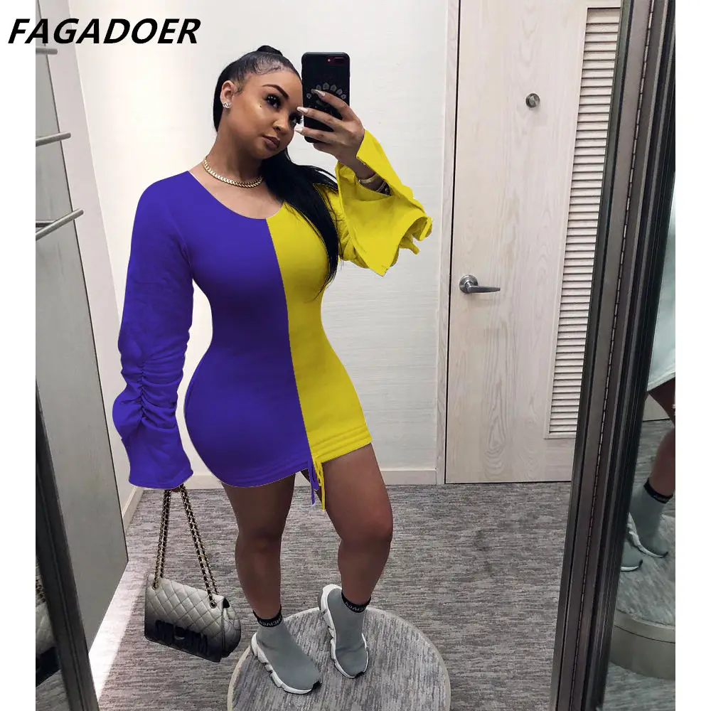 «FAGADOER Patchwork Fashion Bodycon Dress Autumn Color lantern Sleeve Mini Skirt One Piece Drawstring Ruffles Club Party Vestidos» по лучшей цене на рынке! Всего за 16$ (1520рублей)