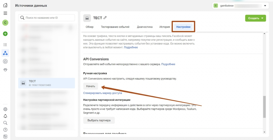 - Далее нужно зайти в Pixel и нажимаем вкладку - "Настройки" и там берем ID пикселя