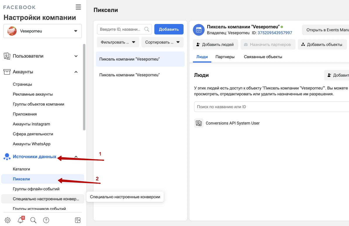 4. Далее нам нужно расшарить пиксель, который есть на БМе и предоставить доступ на личные аккаунты. Для этого заходим на БМ - "Настройки кампании" - "Источники данных" - "Пиксели"
