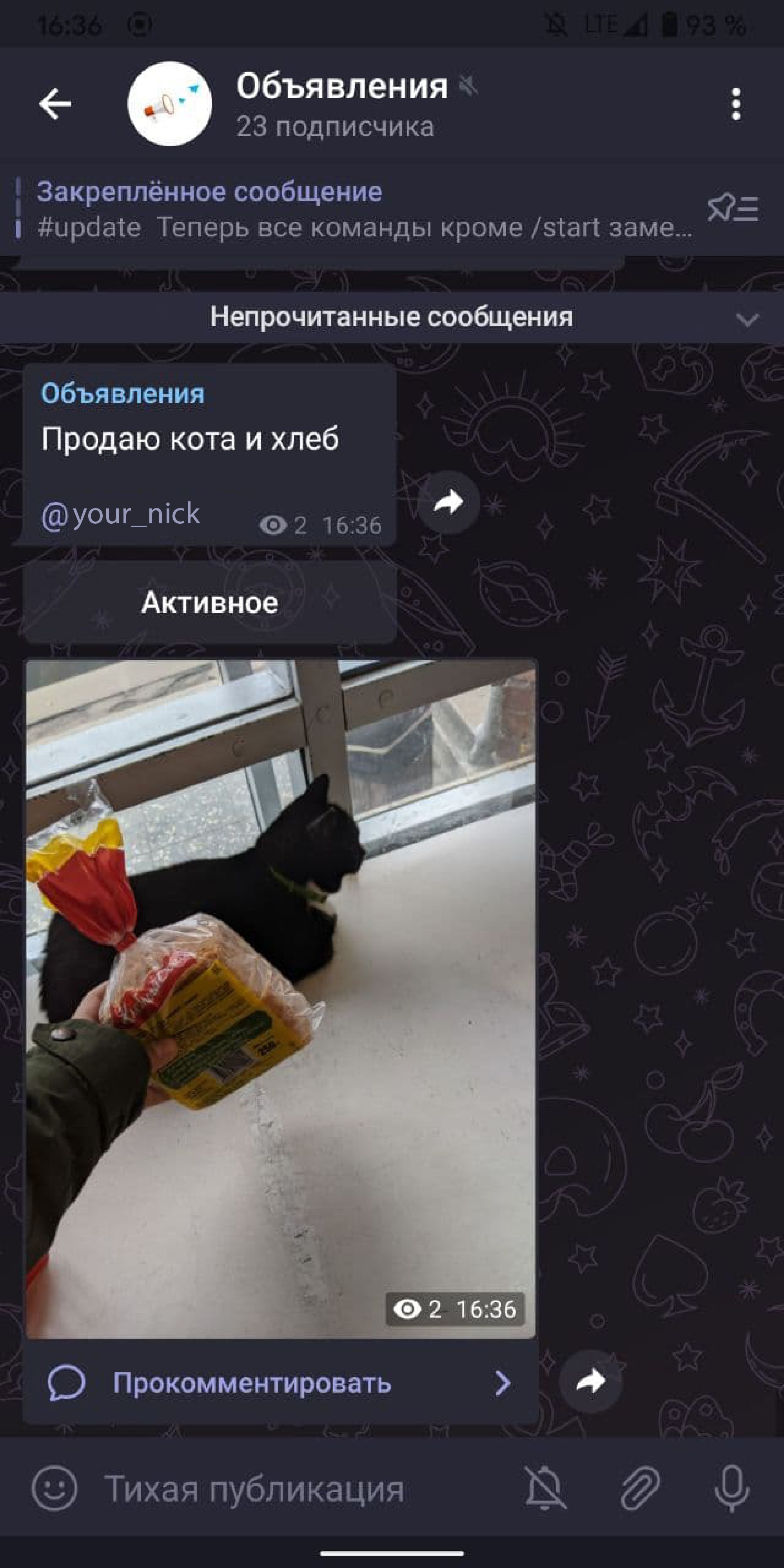 Само объявление будет содержать Ваш никнейм в телеграмме. Не нужно писать в объявлении свой ник - это делается автоматически!