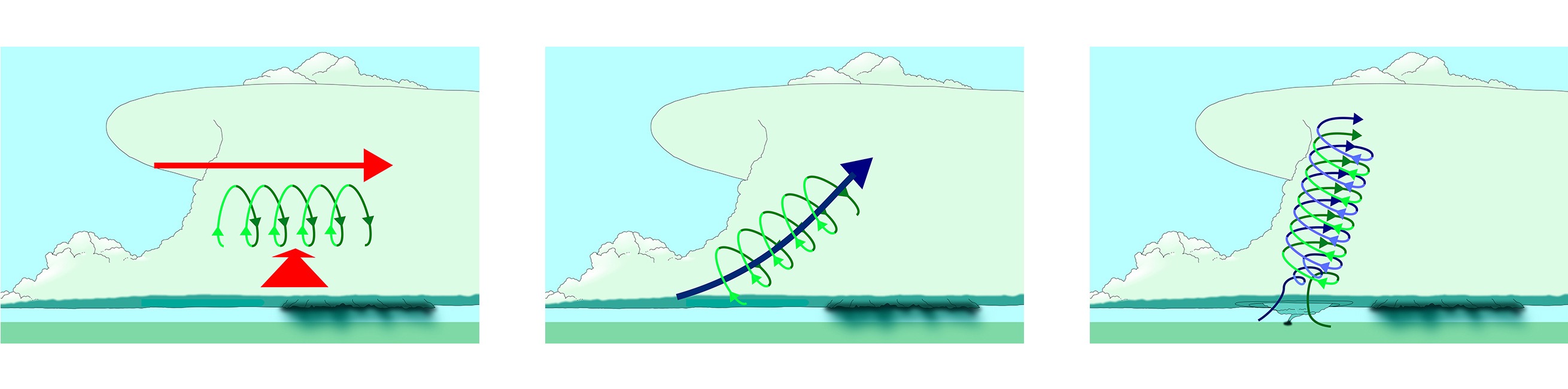 Работая вместе, сдвиг скорости и сдвиг направления создают горизонтальный вихрь в нижних слоях атмосферы, который катится по поверхности земли подобно трубке бумажного полотенца. При наличии конвективной неустойчивости возникает восходящий поток, поднимающий эту трубу из горизонтального положения в вертикальное.