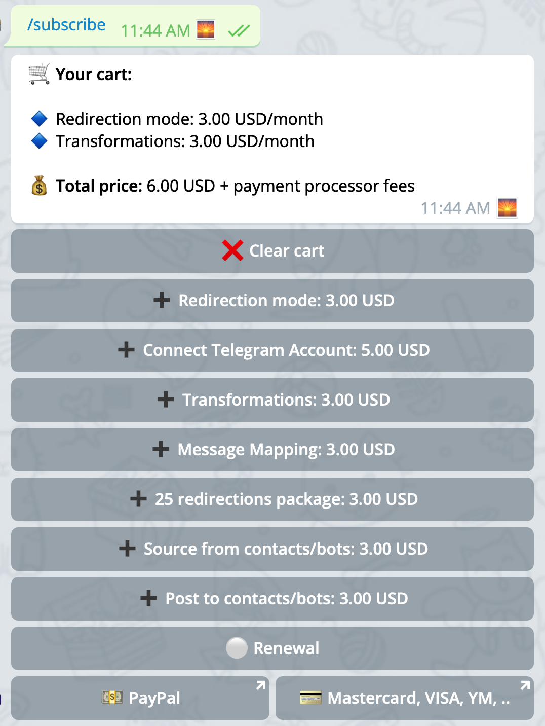 In order to subscribe to these features please go to @multifeed_edge_bot and send it /subscribe command. Put these features to your cart: