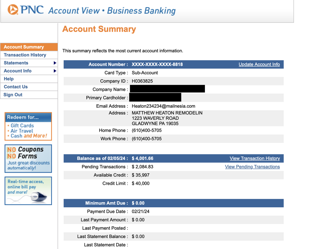 Here we can see the company name, cardholder name, business address and phone number. To accept a mini-deposit or to view the latest successful transactions you need to view Pending transaction.