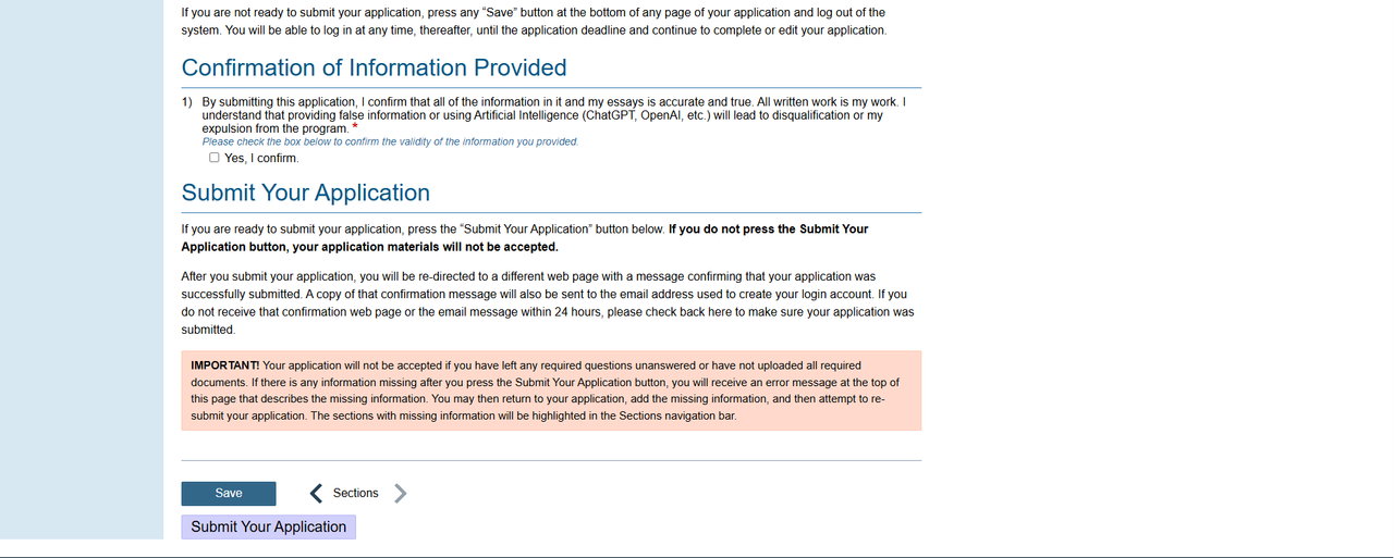 IMPORTANT! If you have left any necessary questions unanswered or have not uploaded all of the necessary documents, your application will not be accepted. You will get an error message at the top of this page, if you click the "Submit" button, you will see the missing information, and re-submit your application. Then you can go back to your application, add the missing information, and try to re-submit the application. The sections with missing information will be highlighted in red in the section navigation panel on the left.