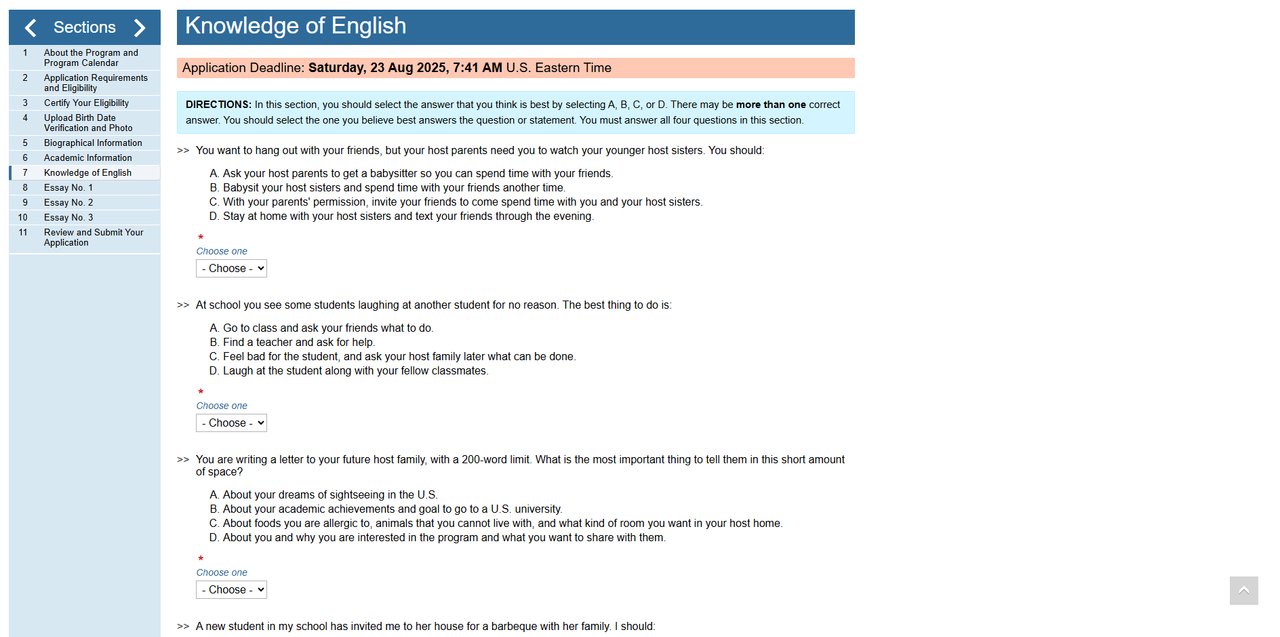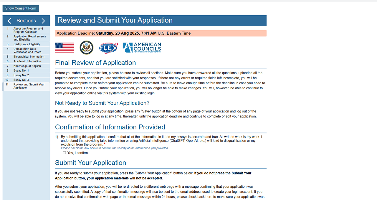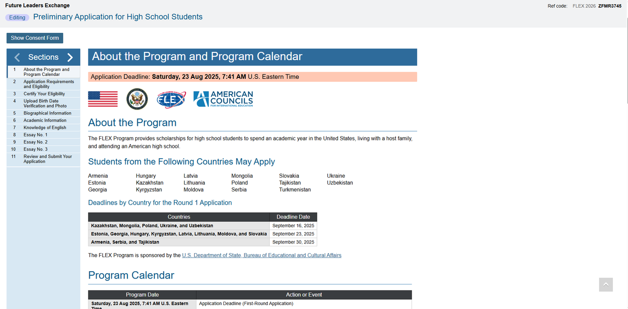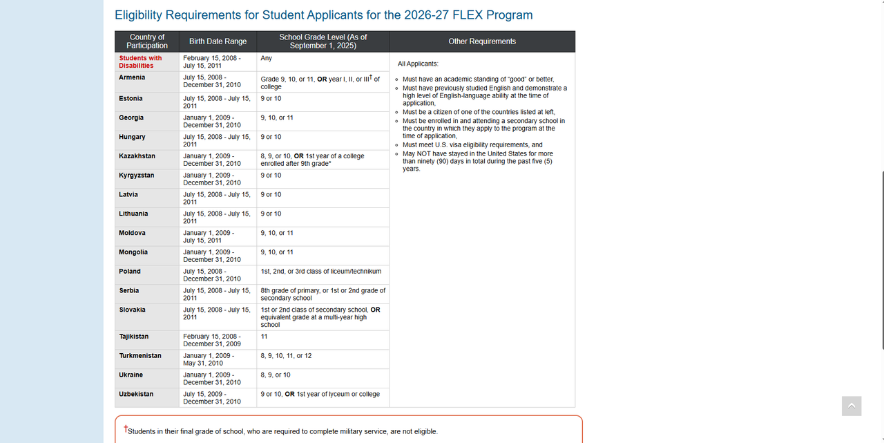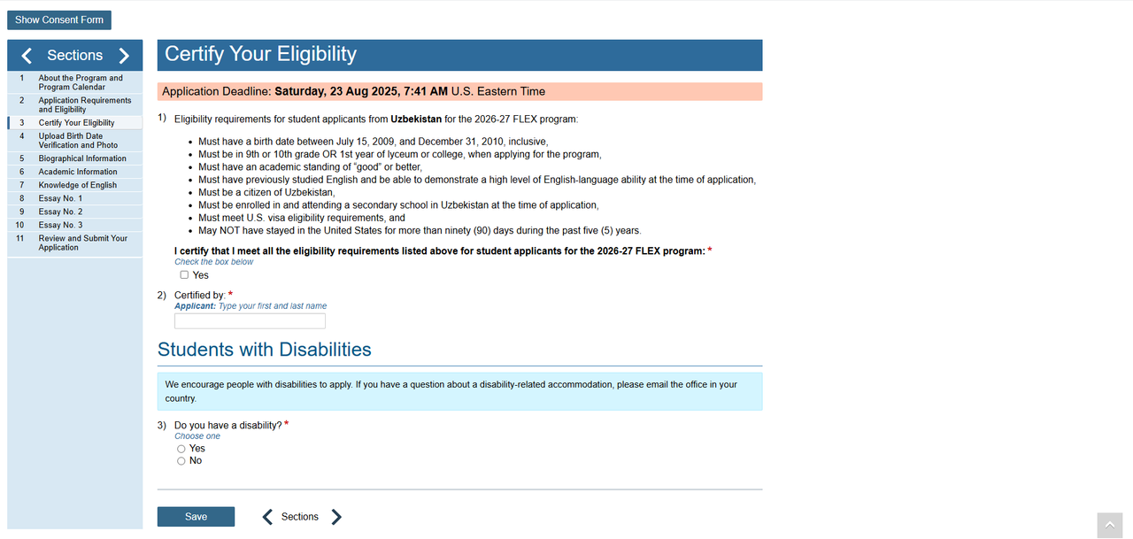 Also, your parents or guardians must familiarize themselves with the program and confirm their consent for your participation. We strongly encourage students with disabilities to apply for the program! If you are a student with disabilities, you must describe your limitations in the form that appears after you click YES. Please email flex.uz@americancouncils.org if you have questions about disabilities and the FLEX program.