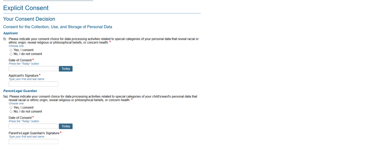 Complete your Privicy Notice and Consent. Be careful, and write your name in the Applicant’s Signature section and your parent’s/legal guardian’s name in the Parent/Legal Guardian Signature section.