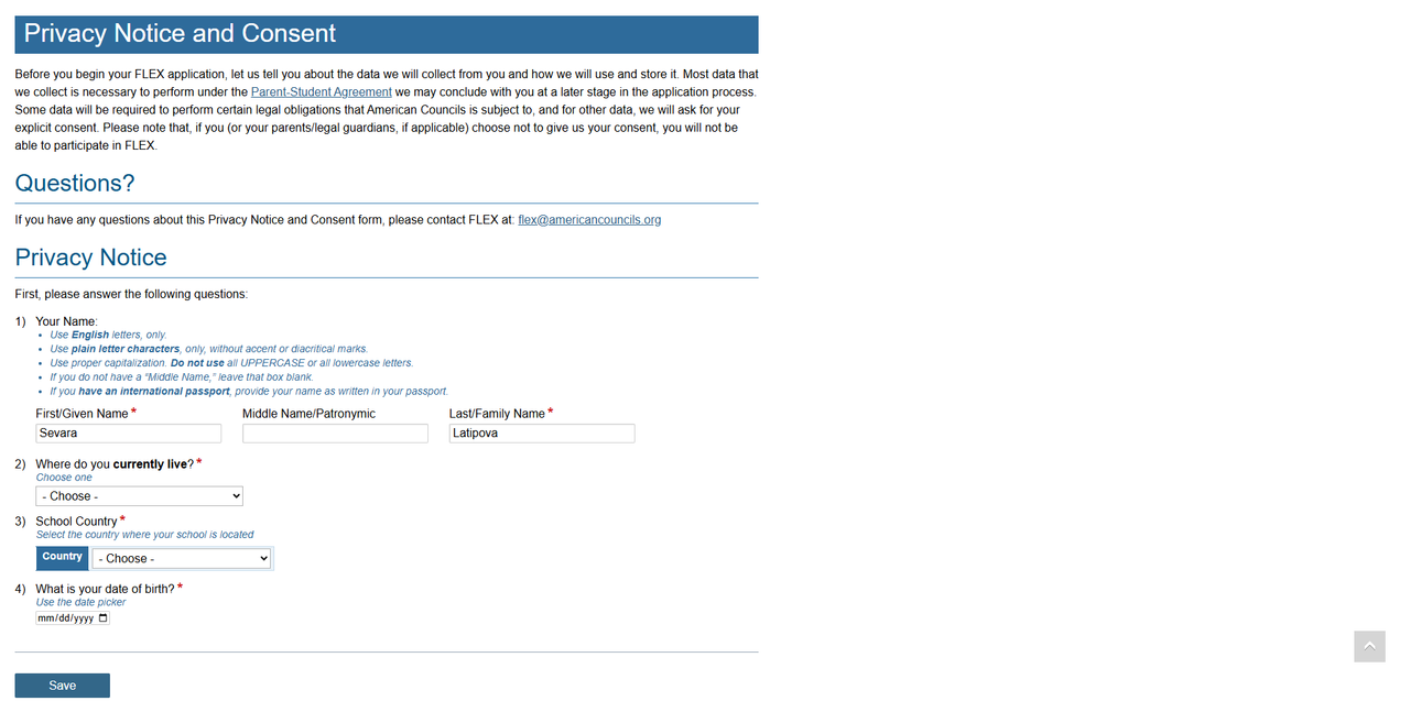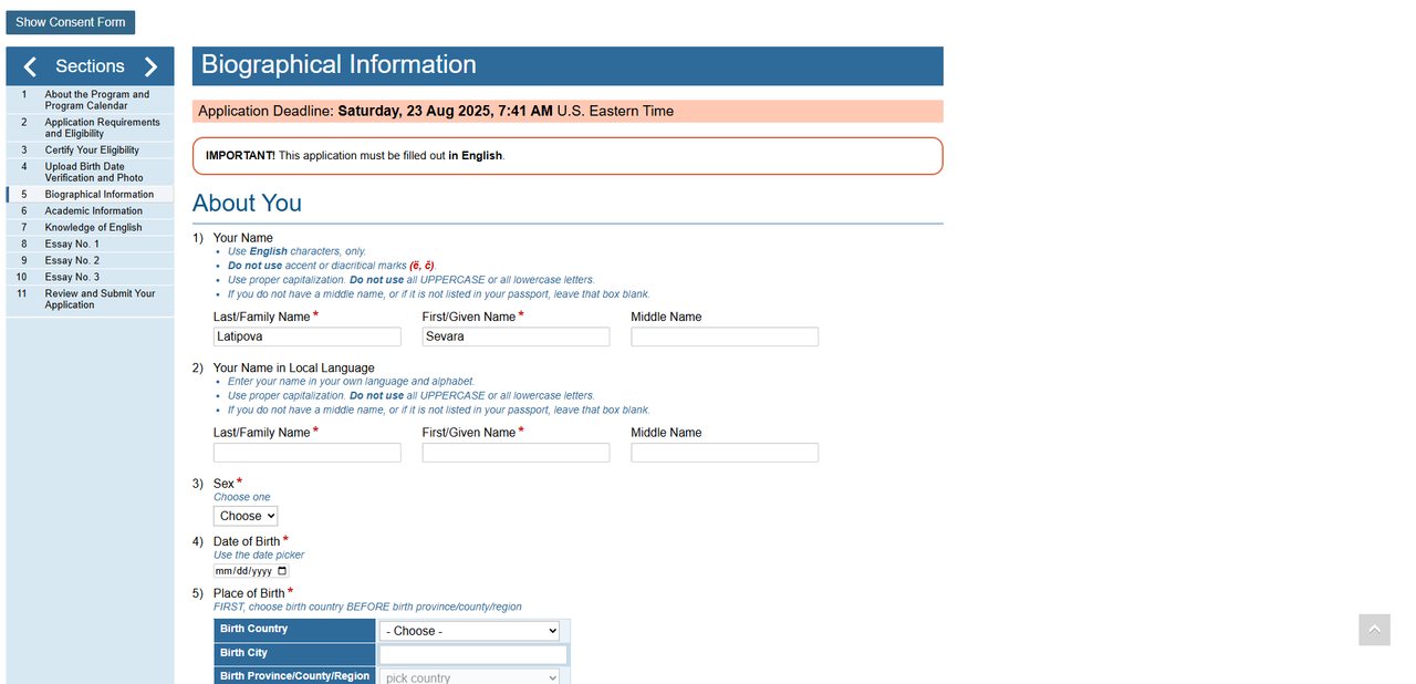 After you start your application, please pay attention to the following information: On this page, you should write your personal data so that American Councils can help you with any questions about the application or inform you that there is little time left before the application deadline. Fill out the application form in English only!