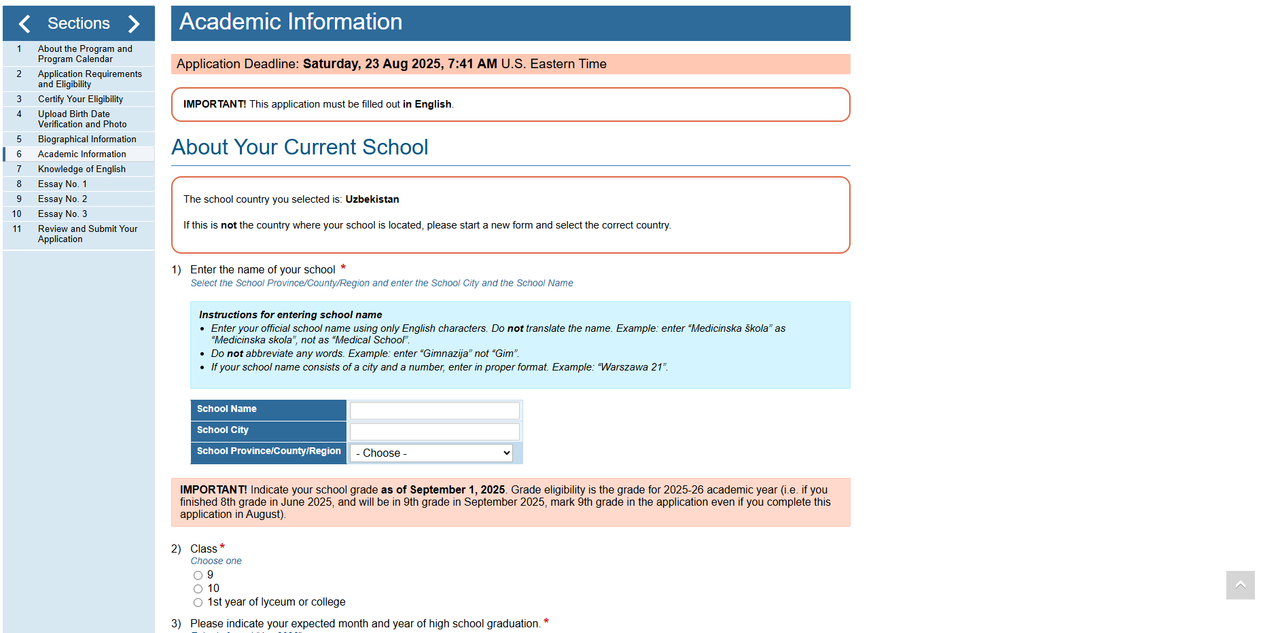 - Be enrolled in and attending a secondary school in Uzbekistan at the time of application;