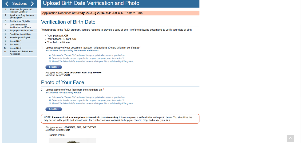 In Section 3, you confirm that you are eligible to participate in FLEX. To confirm that you meet the age requirements, please correctly complete all categories marked with a red asterisk.