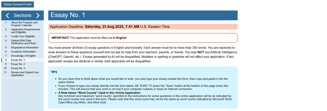 In Sections 8,9,10, you will write essays on 3 questions. You must answer all three (3) essay questions in only in English. Each answer must be no more than 300 words. You are expected to write answers to these questions yourself and not ask for help from your teachers, parents, or friends. Answer these questions honestly. You may NOT use Artificial Intelligence (ChatGPT, OpenAI, etc.). Essays generated by AI will be disqualified. Mistakes in spelling or grammar do not affect your application. If two applicants' essays are identical or similar, both applicants will be disqualified.
