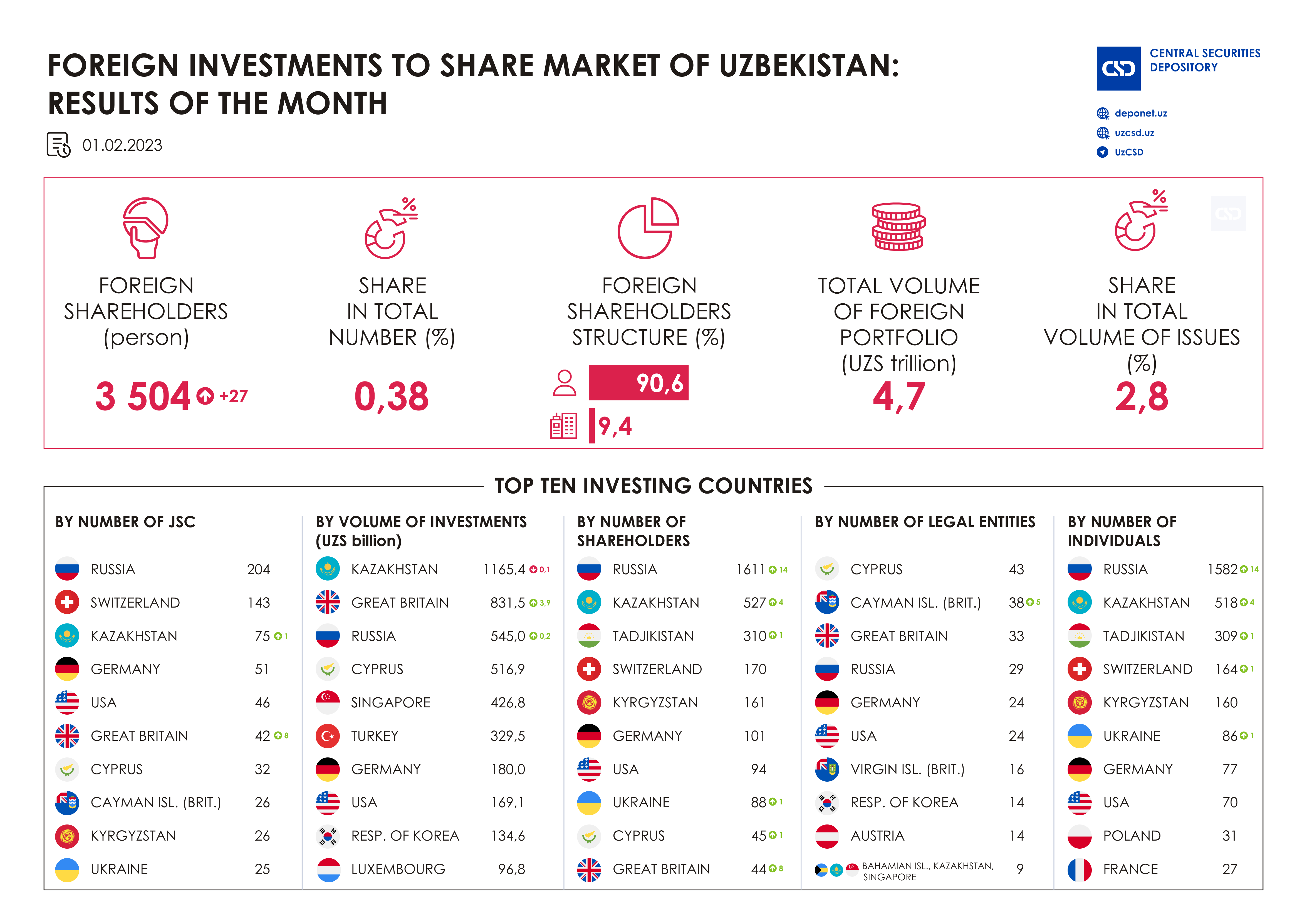 As of 01.02.2023 the number of foreign shareholders totaled 3 504 persons or 0.38% in shareholding structure. The aggregate share owned by foreign shareholders totaled UZS 4.7 trillion or 2.8 % in the aggregated volume of shares issues.