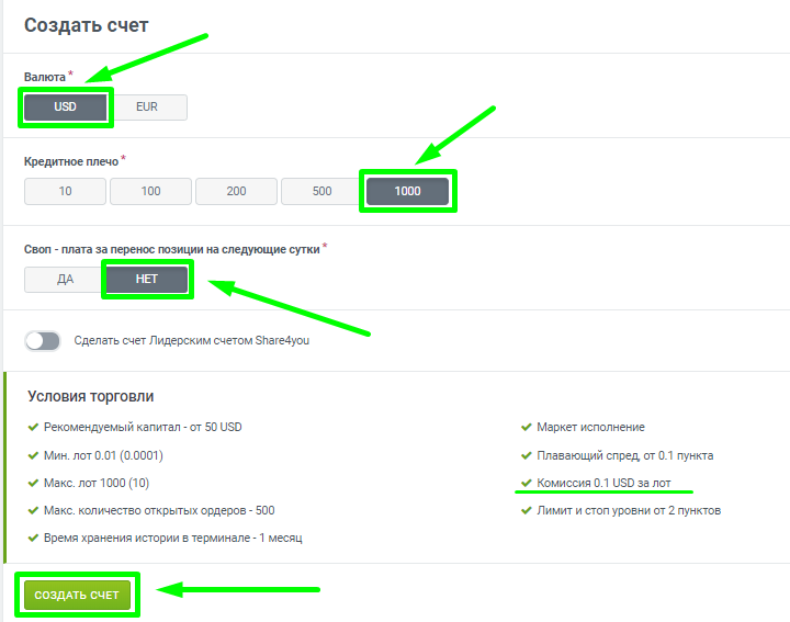 Выбираете всё в соответствии с рекомендациями ниже и нажимаете "СОЗДАТЬ СЧЕТ"