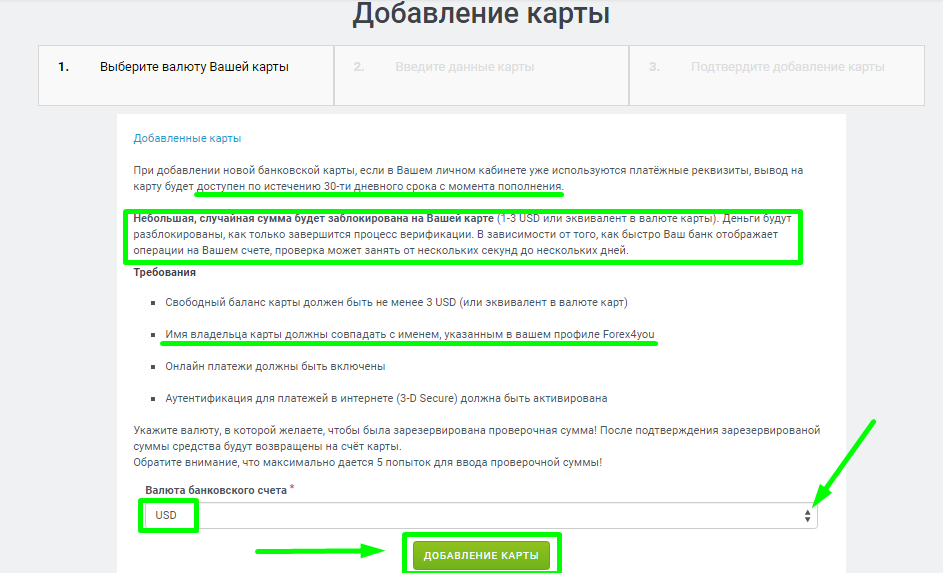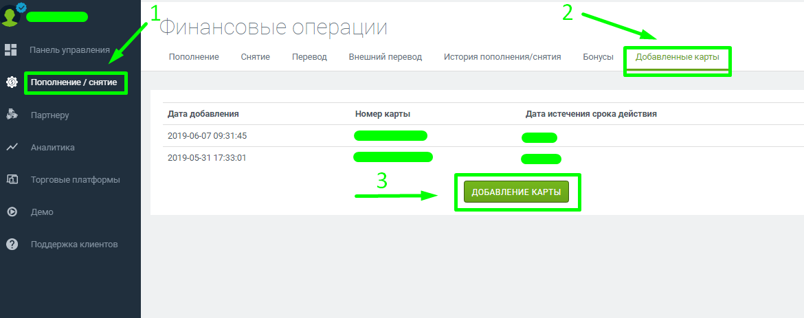 Перед пополнение торгового счёта, необходимо добавить свою банковскую карту. Сделано это в целях безопасности и в дальнейшем выводить средства со счета возможно будет только на эту добавленную в систему карту