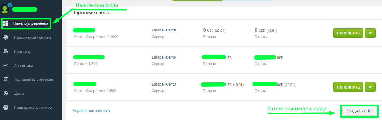 В личном кабинете при регистрации автоматически создается счет, однако он для торговли на роботах не подходит