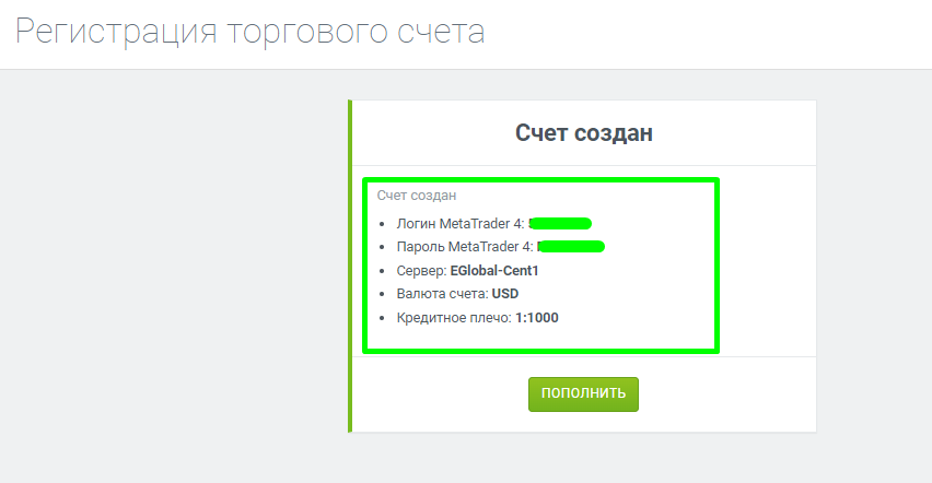 Далее вам предоставят данные созданного счета (логин, пароль и сервер рекомендуем записать или запомнить)