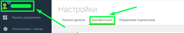 Для этого вам необходимо в личном кабинете перейти на вкладку со своим именем и в настройках справа нажать на «верификация»