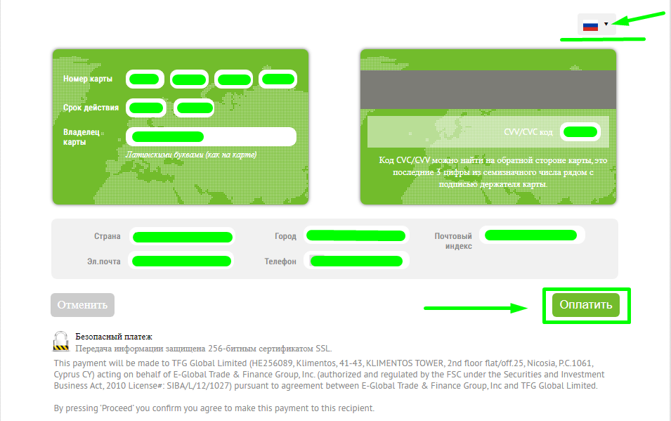 - Имя и Фамилия (вводите на латинице, должно быть так же как и в банковской карте)