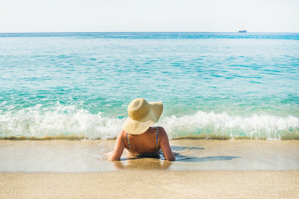 Blonde sexy se met de la crème solaire