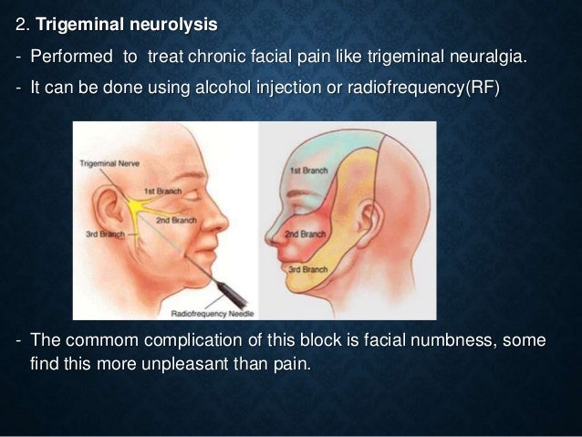 Facial pain is a broad diagnosis that includes a variety of of chronic pain conditions like headaches, atypical migraines, trigeminal neuralgia, and others . . . Botox Injections . . . small amounts of either alcohol or phenol are injected to block the nerve's ability to transmit a signal .
