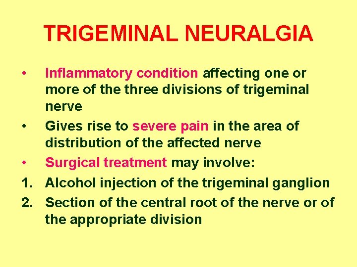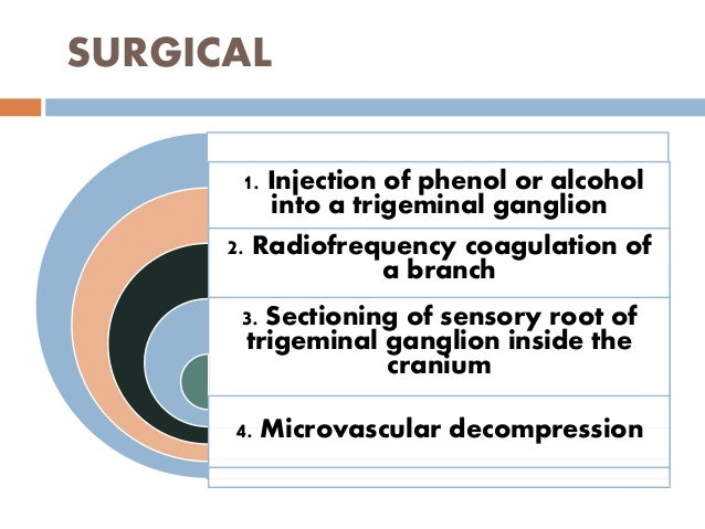 Facial pain info, trigeminal neuralgia is an inflammation of the trigeminal nerve causing extreme pain and muscle spasms in the face . . . . Glycerol injection provides immediate pain relief in 70% of patients [2] . About 50% of patients experience pain recurrence within 3 to 4 years . . . . In glycerol injection, alcohol (green) damages nerve fibers . . .