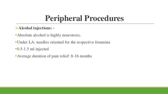 Injections of alcohol are occasionally used for the relief of intractible pain . The hazards of this treatment are discussed and a case of inability toβ¦