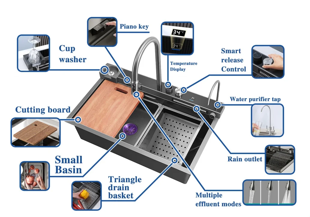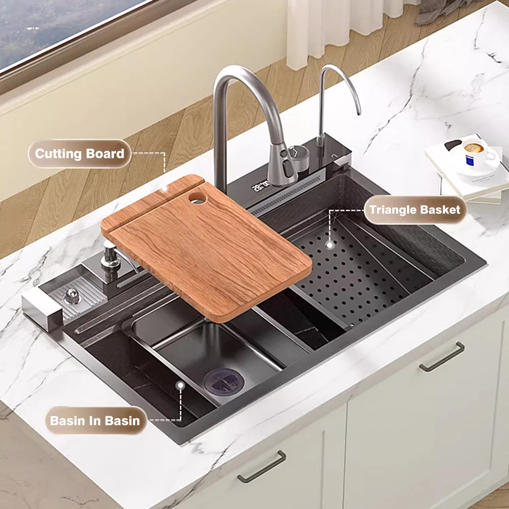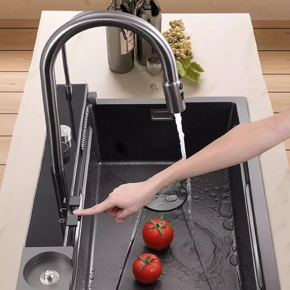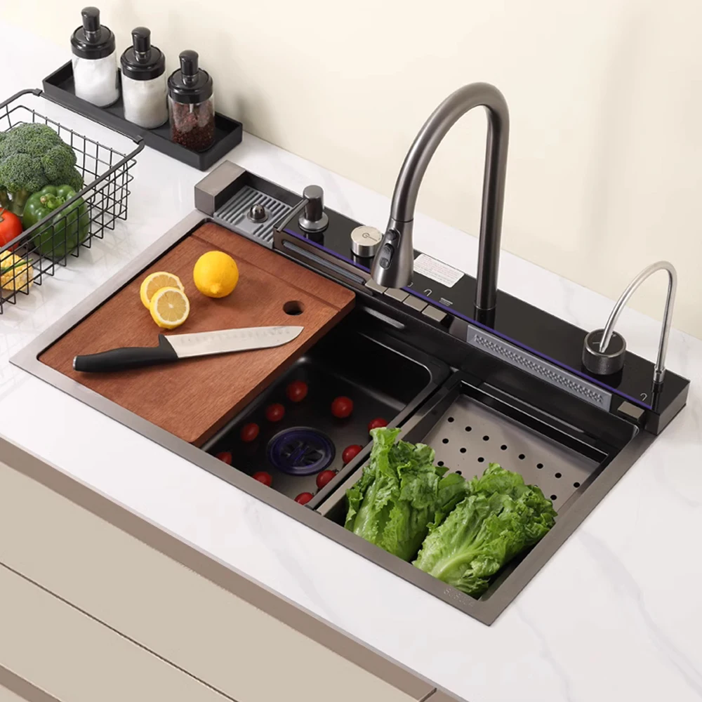 ZZTaQyMbfHere you can buy Factory Direct Supply Modern Popular Large Multifunction Single Sink Waterfall Smart Kitchen Sink Black Kitchen Sink with free delivery to your post office.