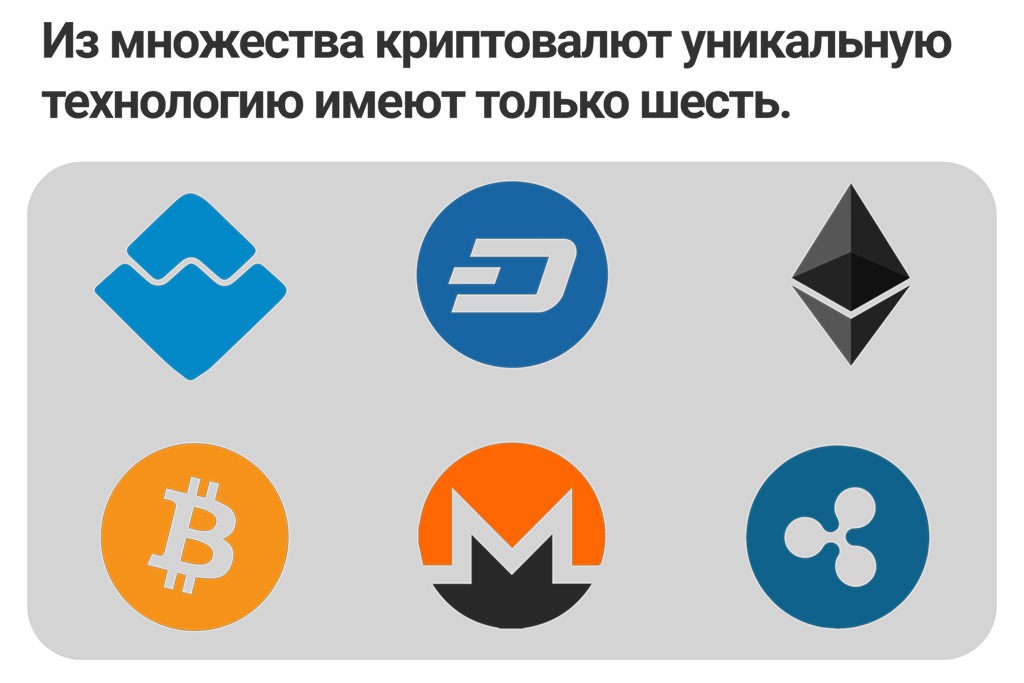 Ведь, как известно, большинство торгуемых на криптовалютных биржах цифровых валют не имеют своей собственной технологии, а лишь заимствуют уникальность разработок, сделанных командами: Bitcoin, Ethereum, Ripple, Waves, Monero и Dash.