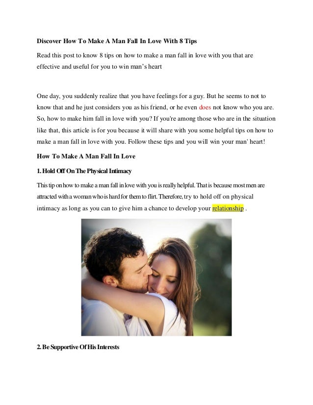 If there's ever a way of knowing how to make a man fall in love with you and be a flirty tease at the same time, this is it . Men can't resist a lingering woman's touch . The next time you're with him, be it clasping palms, hugging each other goodbye, or just crossing the street, let your touch linger softly for a moment longer than necessary .