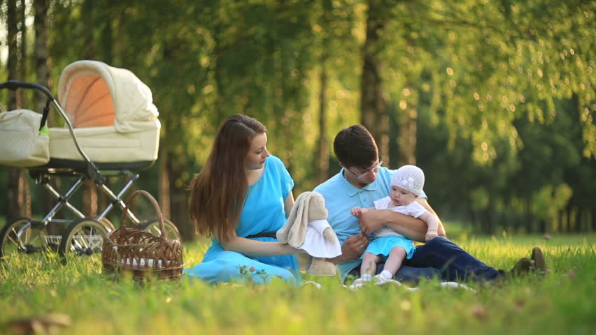Royalty Free Photo of Family mom dad and baby happy with smiles together outdoors in the Park summer portrait in HD.