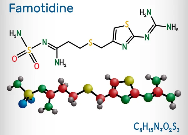 Фамотидин; Химическое соединение; ИЮПАК: 3-([2-(diaminomethyleneamino)thiazol- 4-yl]methylthio)- N'-sulfamoylpropanimidamide: Брутто-формула: C 8 H 15 N 7 O 2 S 3: Молярная масса: 337 .449 г/моль: CAS: 76824-35-6: PubChem: 3325: DrugBank: APRD00296: Состав; Классификация; АТХ