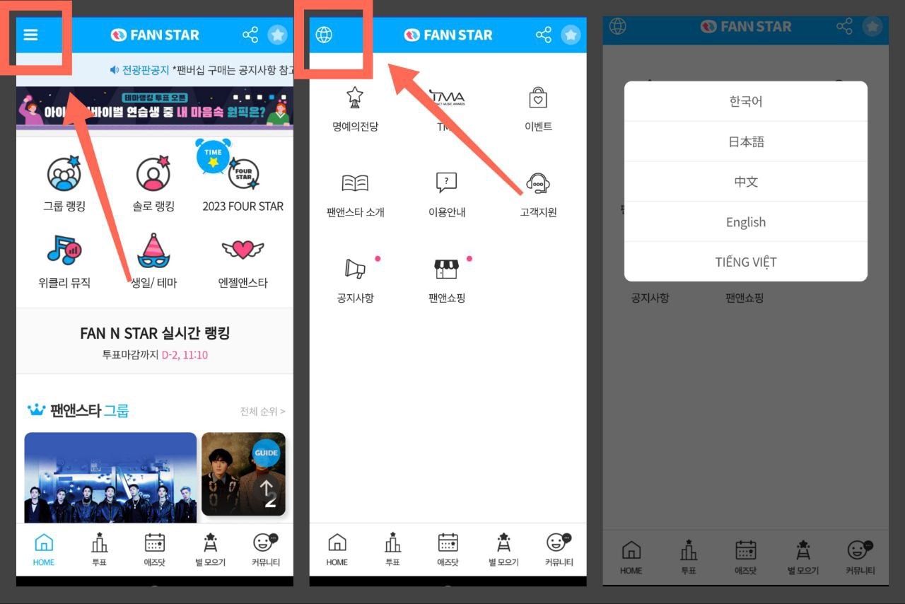 1. Скачиваем Fan N Star по ссылкам, данным выше, или вбив название в магазине. Открываем приложение, интерфейс будет на корейском языке, но его можно перевести на английский. Для этого нажимаем на три полоски в левом верхнем углу, затем на открывшейся странице нажимаем на глобус и выбираем нужный нам язык.