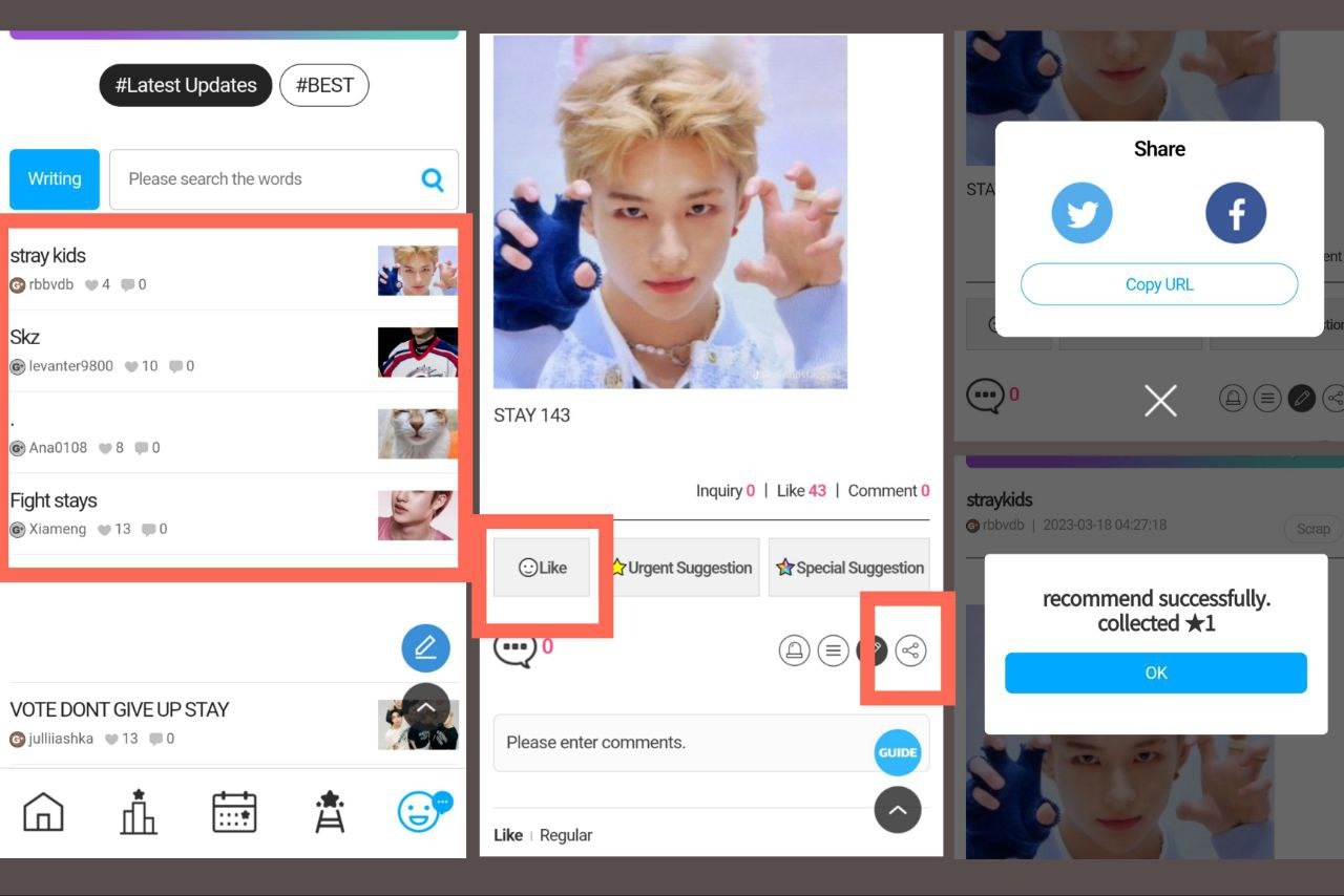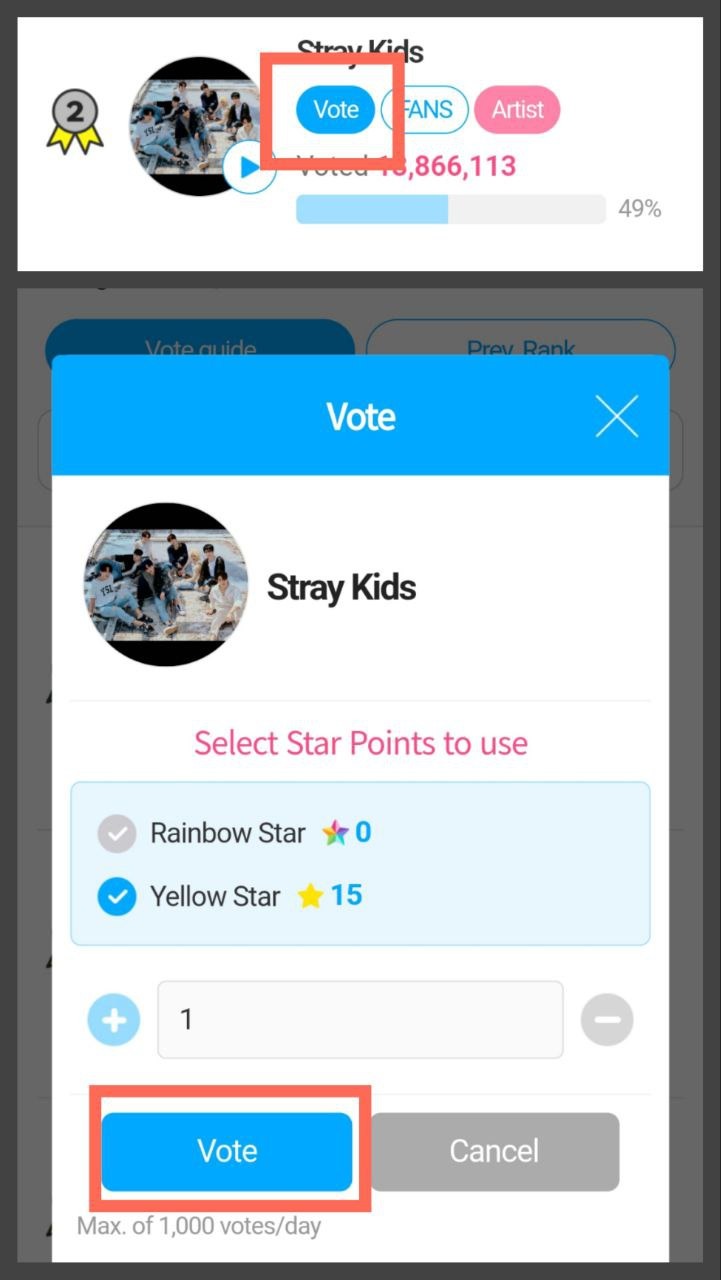 2. Отдавать накопленные сердечки. Для этого нам нужно нажать на кнопку «Vote» рядом с баннером Stray Kids. В открывшемся окне вводим количество звёзд, которое мы хотим отдать, и вновь нажимаем «Vote». В день можно отдать максимум 1 тысячу звёздочек.
