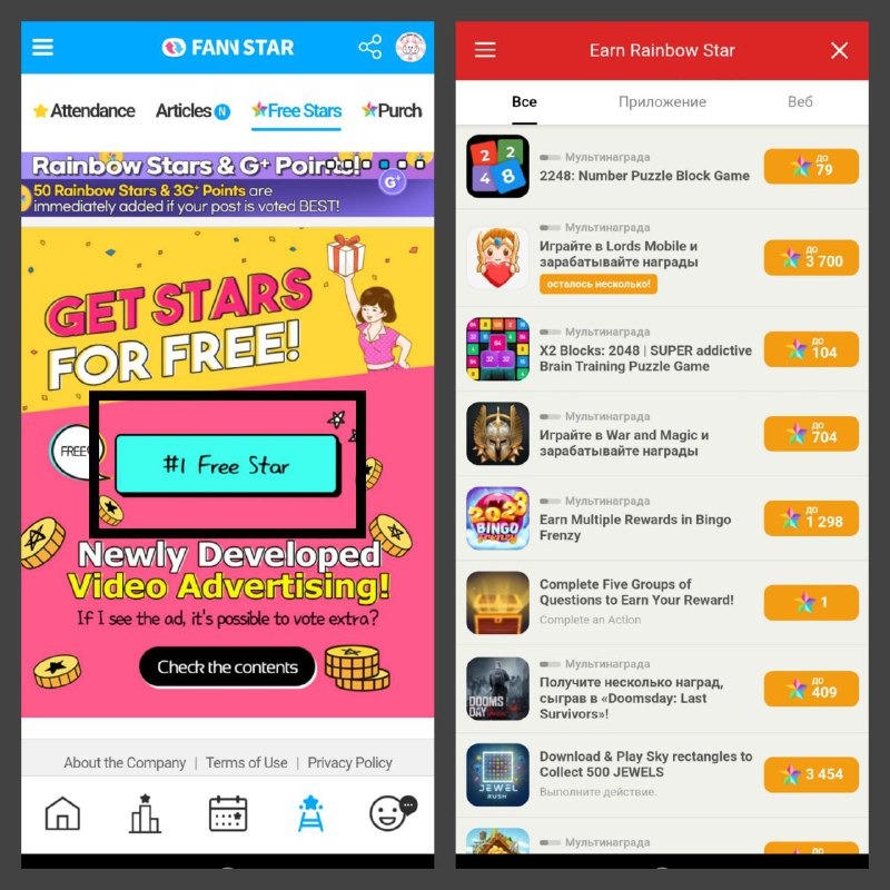 3. Free Starts – это заработок радужных звёзд с помощью других приложений, например, через повышение уровня в различных играх. Этот способ накопления достаточно трудный и может занимать много времени.