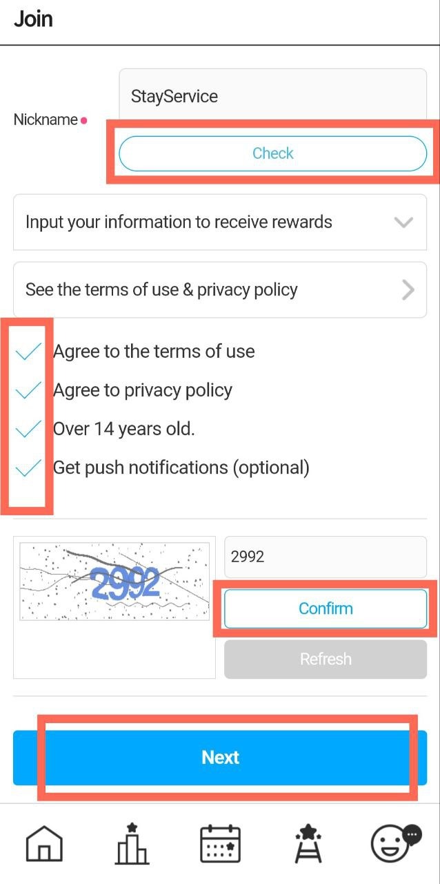 3. На открывшейся странице вводим ник, проверяем его на оригинальность, нажав на «Check», отмечаем галочки для каждого пункта, вводим капчу, нажимаем «Confirm» и затем «Next».