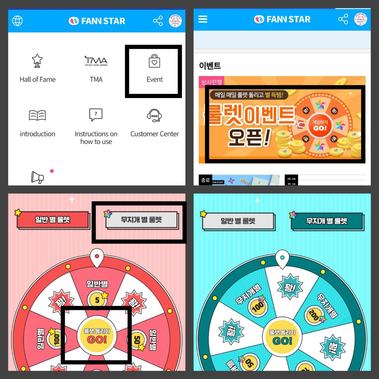 Нам нужно нажать на три полоски в левом верхнем углу ➡️ выбираем значок «Event» ➡️ нажимаем на оранжевый баннер с рулеткой ➡️ тапаем в центр баннера на кнопку «GO!» и затем на синюю кнопку ➡️ далее можно выбрать вторую рулетку, где можно выиграть другой вид звёзд.