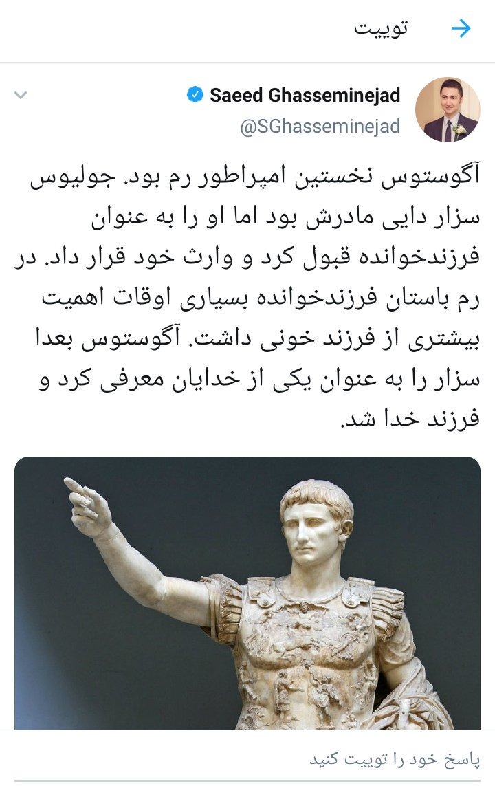 ۷. درباره این توییت هم ایشان پاسخی ندادند و از ماجرا گذشتند! اما سومین توییت مرتبط با این دو توییت، توییت درباره آگوستوس است و مسئله فرزندخواندگی. دوستان! لزومی ندارد که فرزندخوانده یک شخص باشد، و در زندگی شخصی.