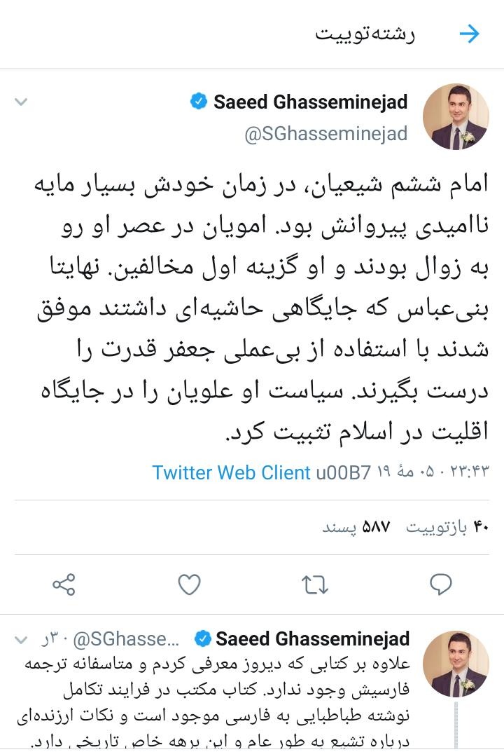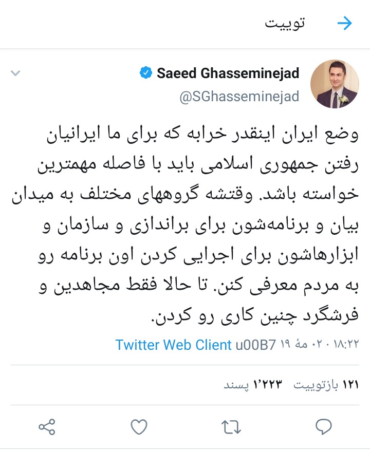 در مدت اخیر، سعید قاسمینژاد، سه توییت زده است. نخستین آنها، توییت زیر با دو عبارت کلیدی است: "برنامه براندازی" و "مجاهدین و فرشگرد". این یعنی چه؟