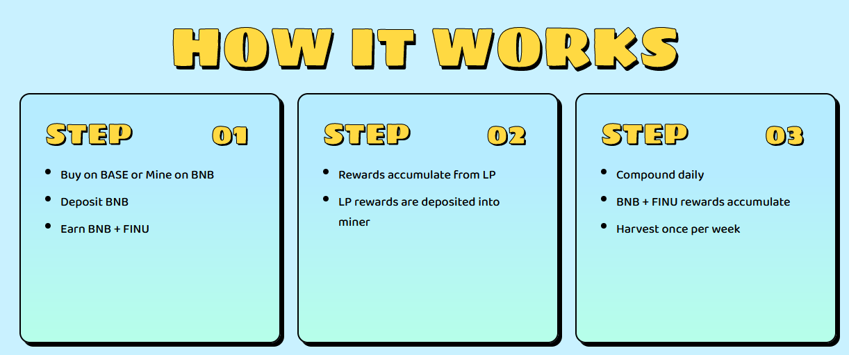 Finu is the first omni chain mining dog coin on Base and Binance Smart Chain. With its own decentralized app, Finu is giving an 8% daily return to its miners in forms of BNB, while Finu's native token is constantly increasing the TVL (Total Value Locked) of its miner with a 1% of every transaction (buy or sell) going to contract of the miner. Only Finu holders have the ability to start mining and earn daily rewards. Ready to start mining with Finu?